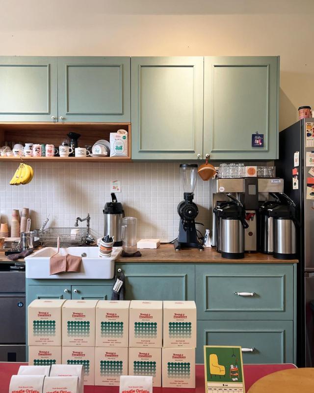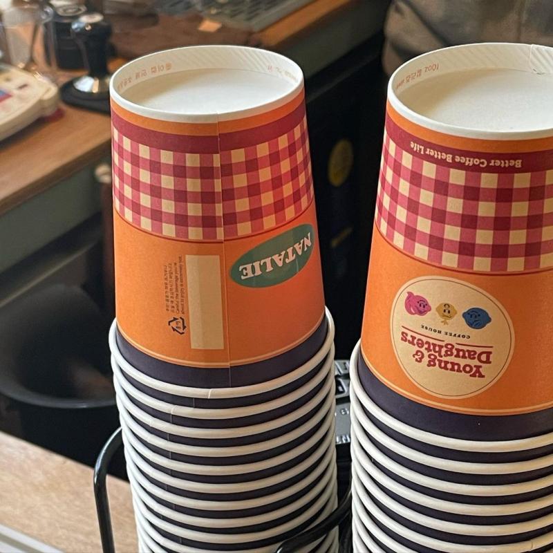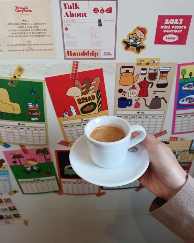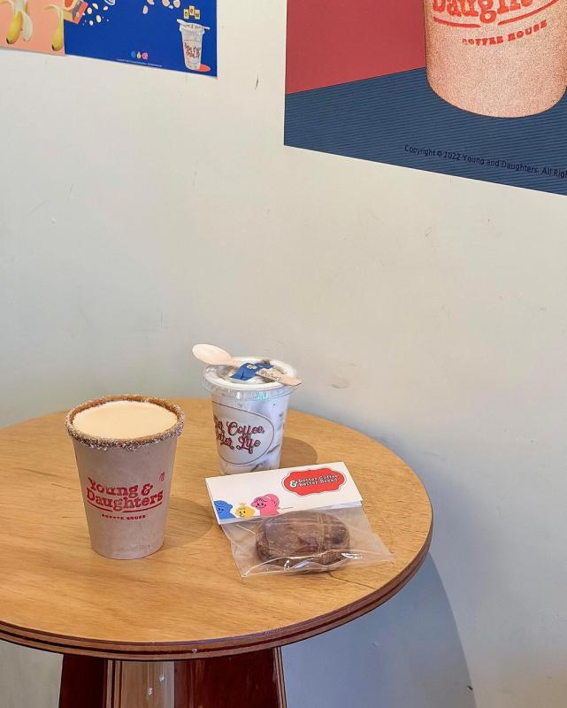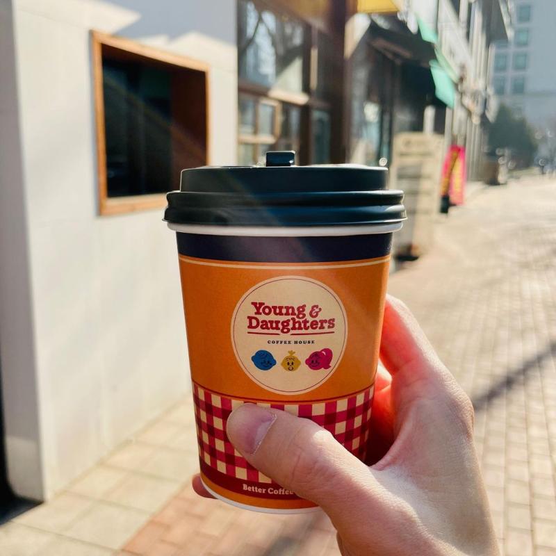곳곳에 붙어있는 영앤도터스의 심볼과 귀여운 굿즈들도 판매하고 있어서 보는 재미가 있었다. 한쪽 공간에는 로스팅 기계가 있고, 원두도 판매하고 있어 커피를 좋아하는 사람이라면 공간이 넓지 않아도 즐길 수 있는 카페인 것 같다. 앉을 좌석이 있었다면 더할 나위 없이 더 좋았을 것 같다.