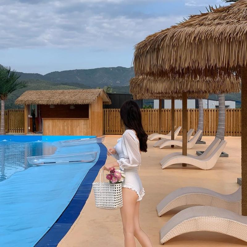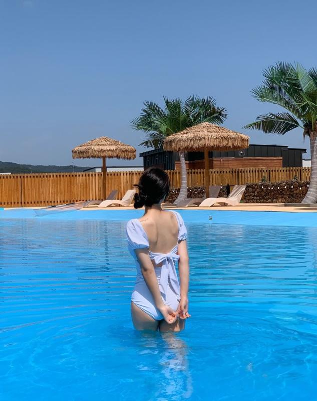 연출해주며 아방한 퍼프 소매가 유니크한 매력과 동시에 팔뚝 군살들을 자연스럽게 가려주는 모노키니 수영복이랍니다~~💙 가로 핀턱 주름이 유니크하고 체형을 날씬하게 연출해주며 모노키니 디자인으로 군살들을 자연스럽게 커버해주어 몸매를 더욱 날씬하게 연출해줘요🎈🎈