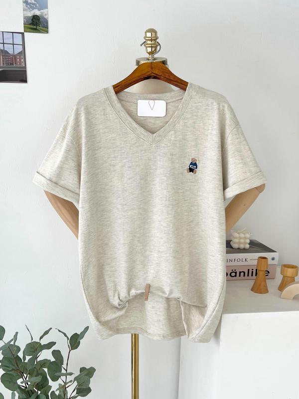 브이넥 자수 곰돌이 루즈핏 반팔티셔츠