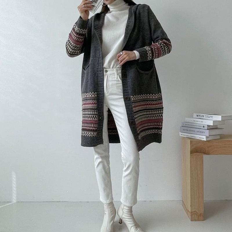 여성 미시룩 에스닉 오버핏 후드 니트 롱가디건