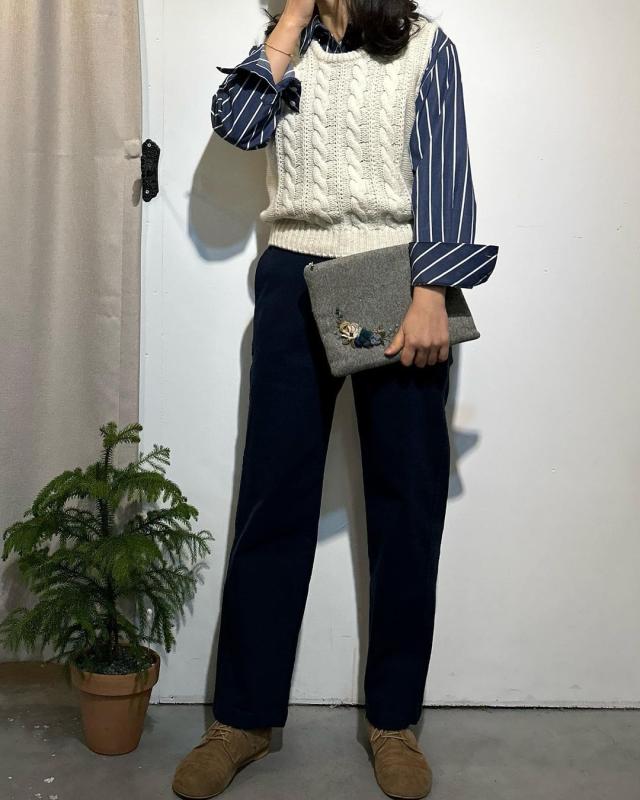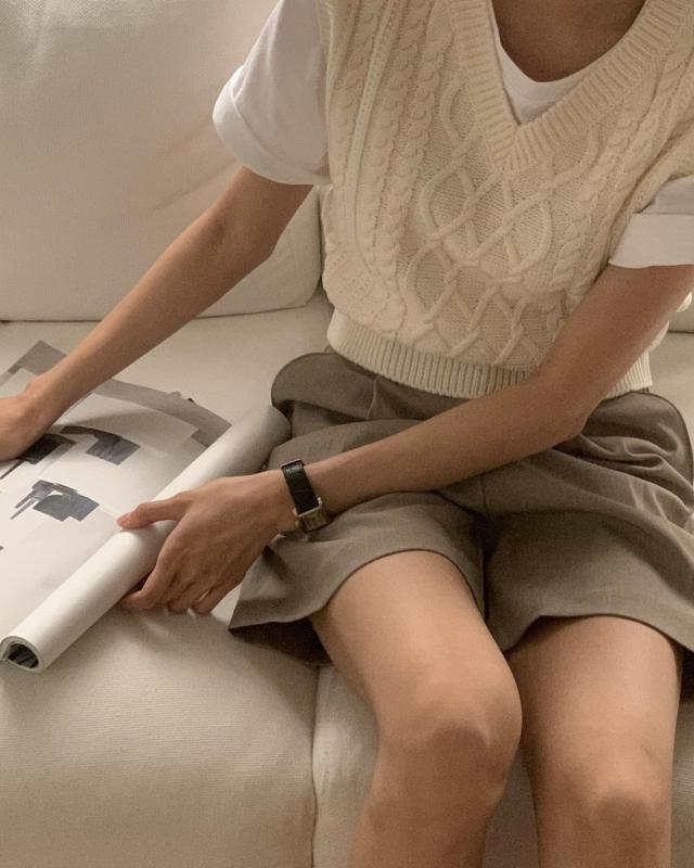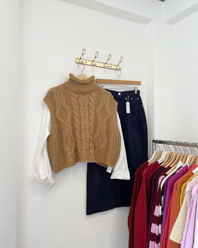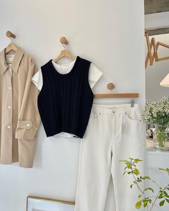 밑단 시보리가 잡아주어 핏이 더 살아나는 케이블 니트조끼🥐 아이보리 컬러로 활용도도 🫶🏻