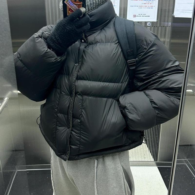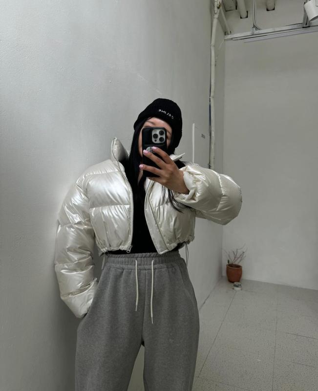 진주 펄 색상의 유광패딩으로