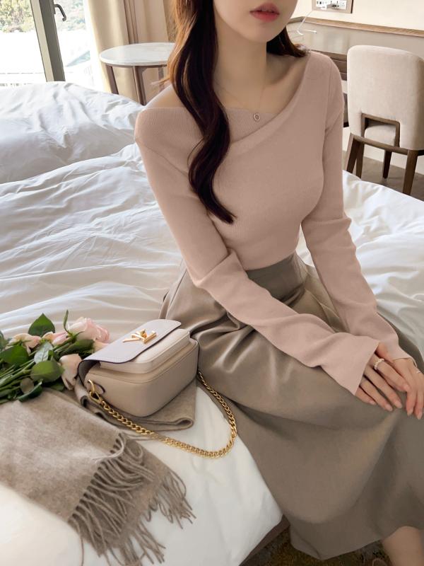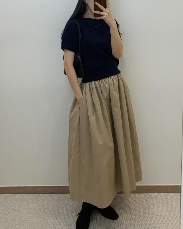 보트넥니트는 시보리가 잘 잡아줘서 스커트랑 매치하기 너무 . 볼륨스커트 검정,베이지 둘다 코디해봤거든요. 근데 둘다 넘 예뻐서😘 밴딩스커트 사랑🫶🏻 베이지 컬러는 이번에 입고되었어용. 함께 업뎃해둘게요!