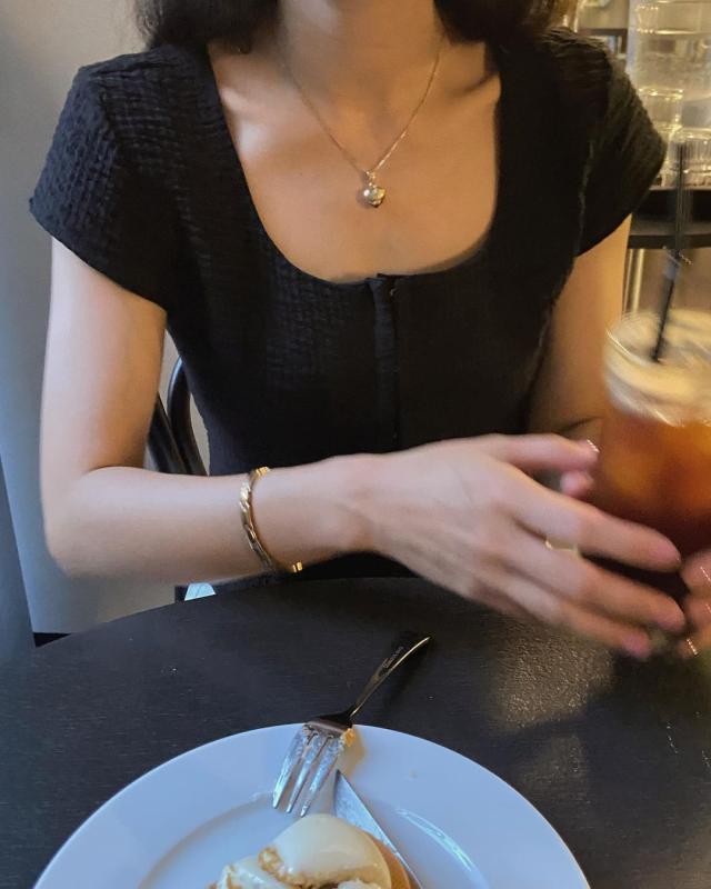 쇄골이 보여서 목이 길어보이며 여성스러움의 극대화. 목걸이도 잘보임.