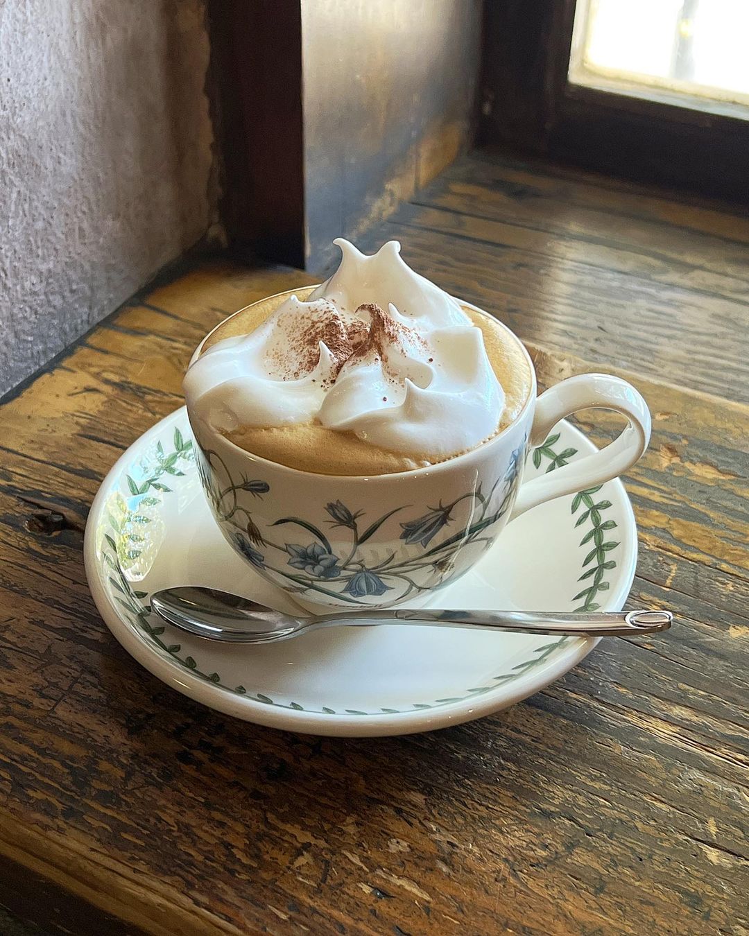 구름같이 폭신해 보이는 크림과 함께 부드러운 커피를 한 입 마시면 쌉싸름하면서 부드럽고 달콤한 맛이 입 안으로 확 퍼집니다.