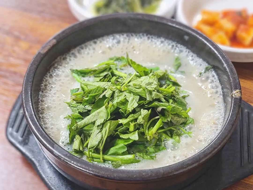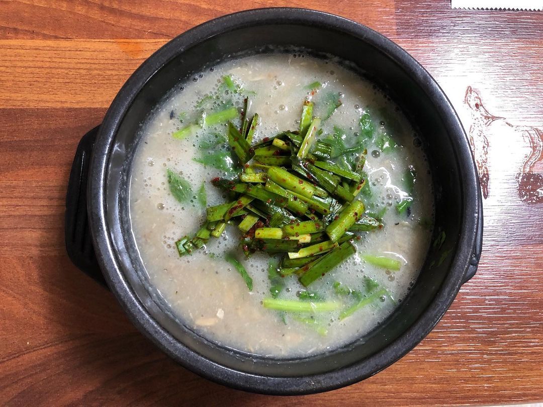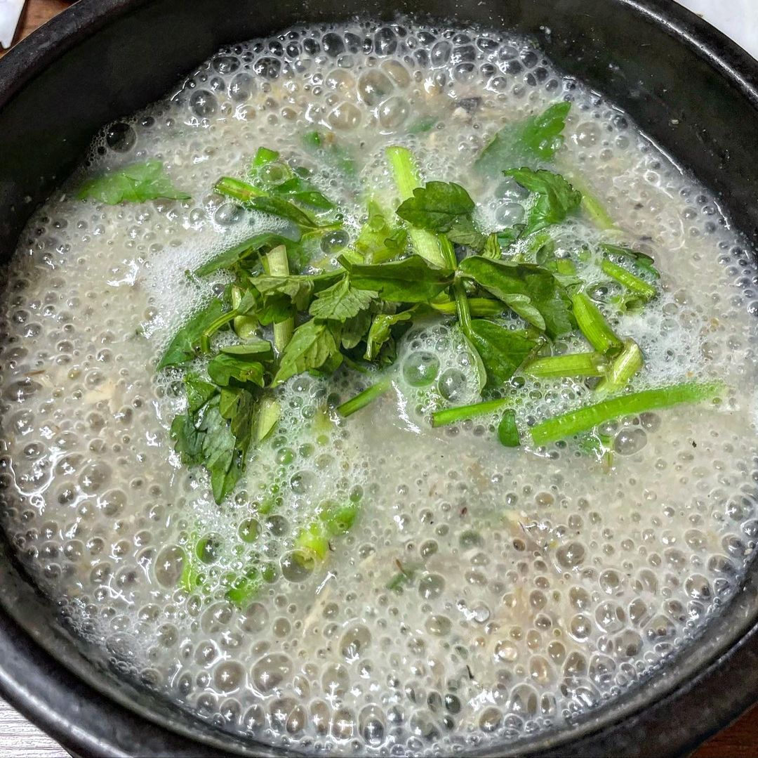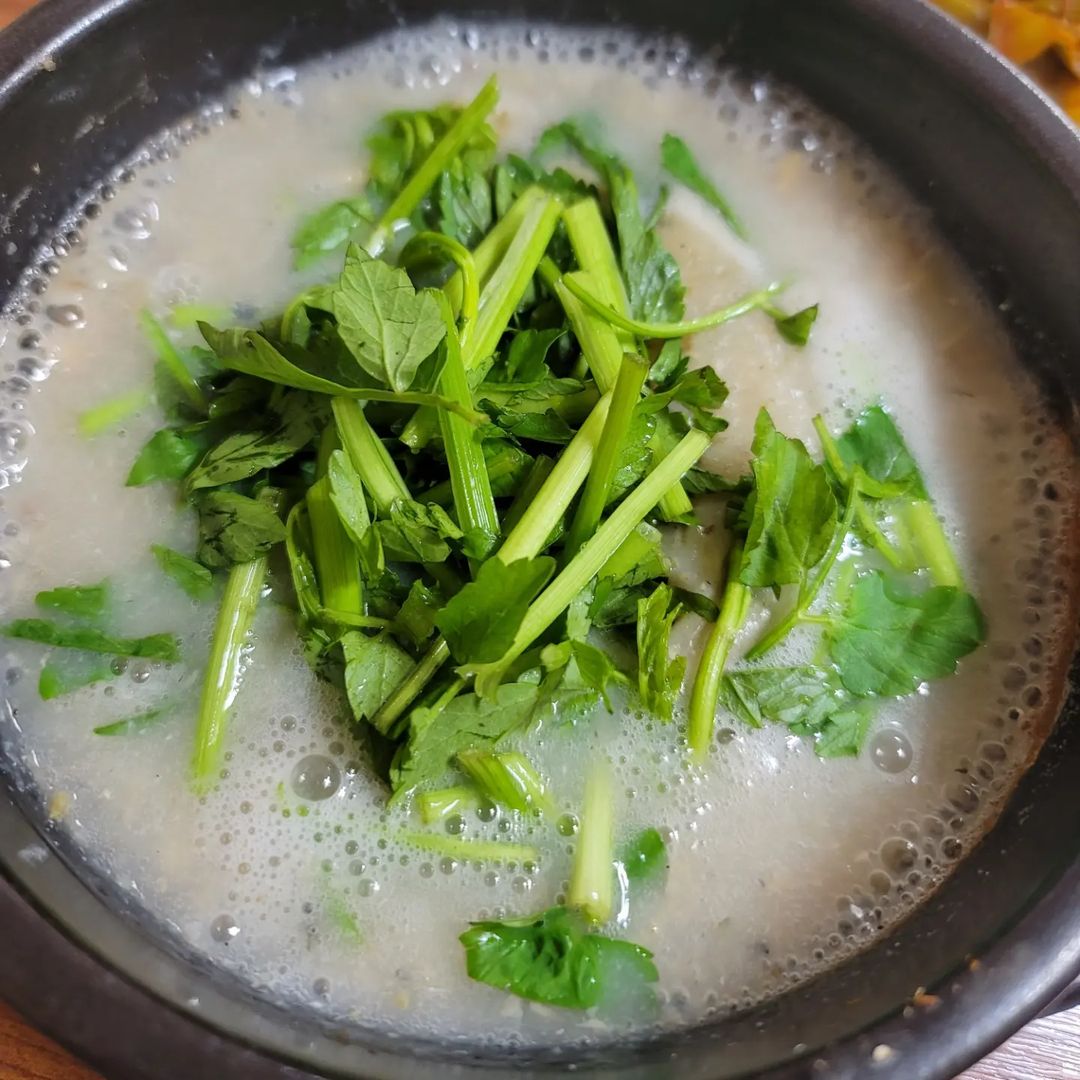 걸쭉한 스프같은 국물에 미나리, 부추를 넣어 먹는다.