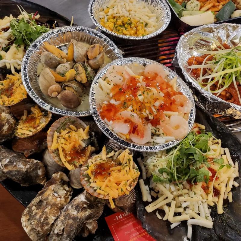 가리비 무한리필 메뉴에 갈릭버터전복, 매콤 파불고기, 키조개 파스타, 통새우 그라탕, 콘치즈, 해물떡볶이, 해장라면, 모짜렐라치즈, 후식 아이스크림까지 이거 다 포함이에요. 심지어 네이버예약하면 통새우 멘보샤랑 버터 새우구이가 서비스로 나오니까 조개구이 먹으러 여기만 갑니다.